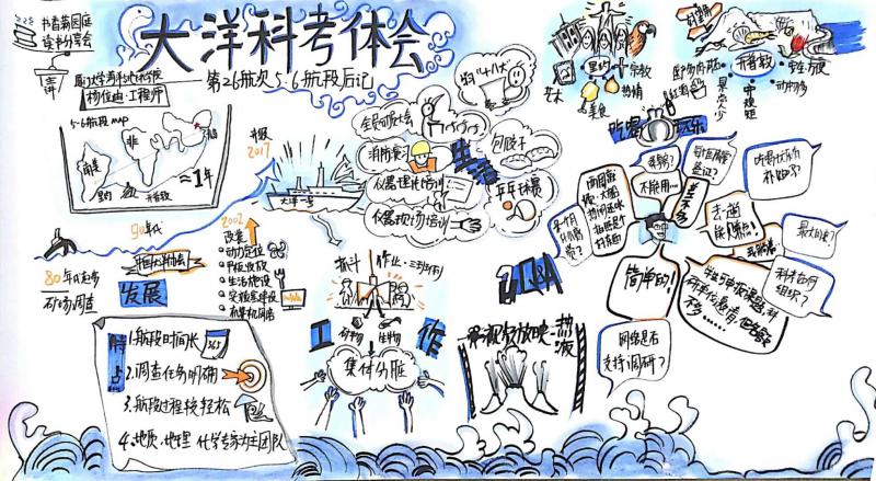 本次分享会还邀请了视觉引导师橙子,为大家做了一份绘声绘色的活动记录。大洋科考分享会的圆满举办,丰富了同学们对大洋的认识,对大洋科考人的认识,也引导了大家积极地去了解海洋、探索海洋,同时也鼓励了海洋学子为建设“海洋强国”作出贡献。蔚蓝社和德旺图书馆将会继续推出更多的精彩活动,丰富同学们的课余生活,拓宽校区师生的眼界。