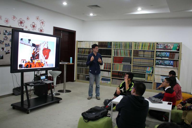 2017年11月30日晚,精彩的大洋科考分享会在翔安德旺图书馆梦享屋顺利举行。本次活动由德旺图书馆主办,蔚蓝社承办,活动邀请了海洋与地球学院工程师杨位迪做分享嘉宾,杨老师妙语连珠,活动现场气氛热烈。