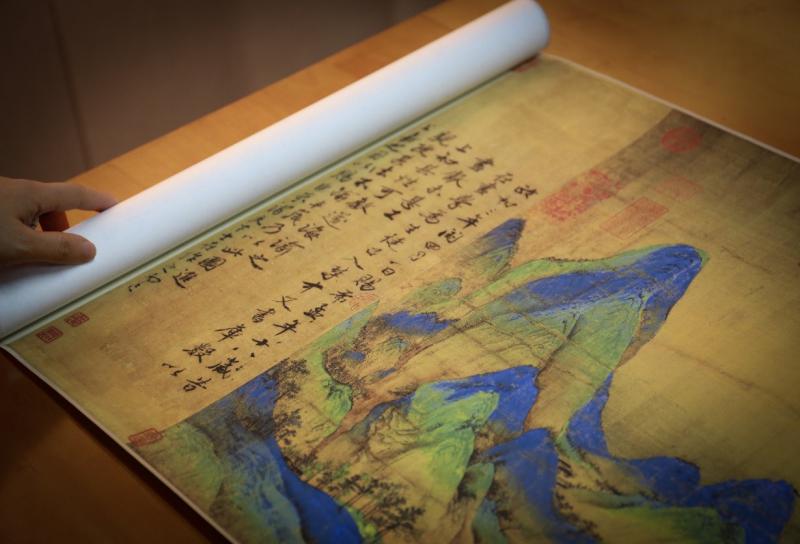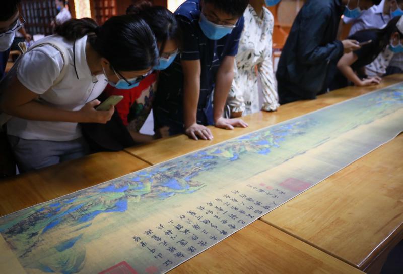讲解完毕,大家小心翼翼又迫不及待地移步到这幅11.9米长的史诗级青绿山水画作之前。画卷徐徐展开,每个人屏气凝神,慢慢“沉浸”入画卷的壮阔之中。大家寻觅着每一个细节,连绵山峦、浩渺江河、亭台楼阁、茅居村舍、渔船扁舟,还有隐藏在山海之中的“通隐桥”,近距离品鉴“大好河山”的开阔和精美。