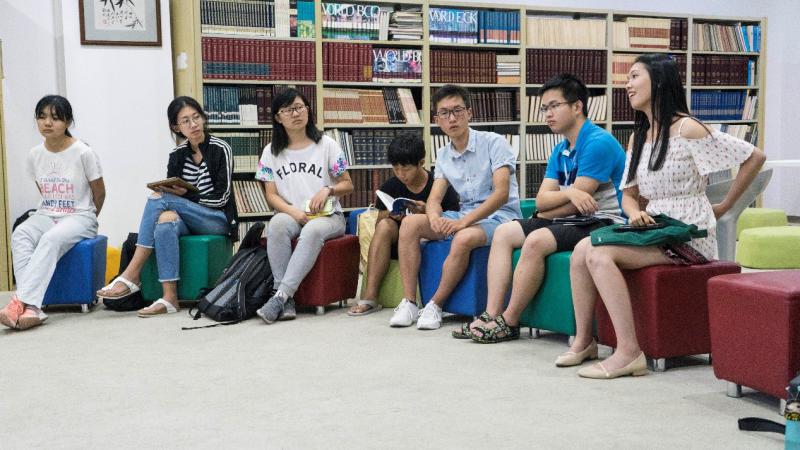 5月16日晚7点半,德旺图书馆梦享屋清风习习,“书香满园庭”系列读书会之《寻路中国》专场活动正在进行。同学们“以书会友”,在主持人朱凯峰的带领下,跟随美国作家彼得·海斯勒镜头一般的语言,换一种视角品读、体察我们日日夜夜生活其中的中国大地。