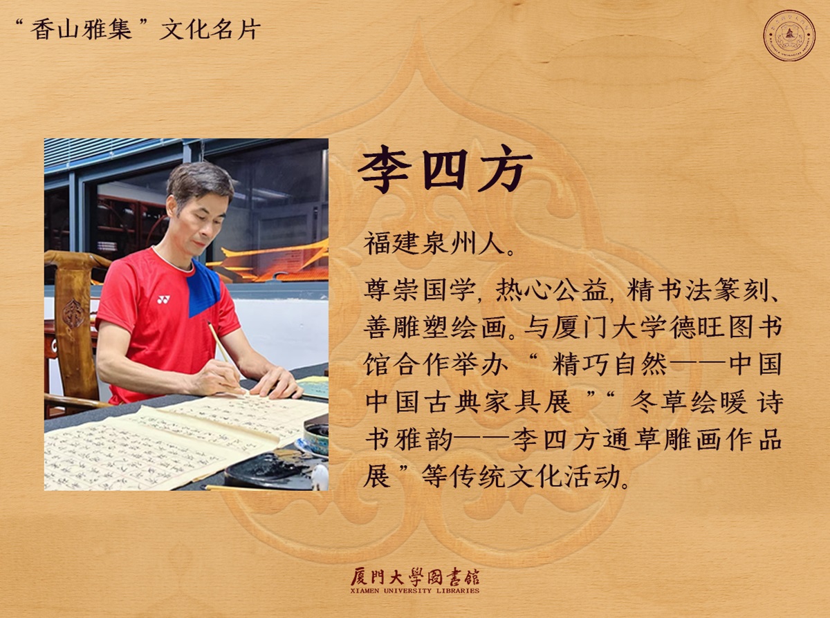 本次展览共展出中国古典家具二十余件,多以明清制式为主,所有展品均来自李四方先生的个人收藏。李四方先生尊崇国学、热心公益,精书法、善雕刻,收藏古典家具多年。他希望人们通过近距离接触这些实物器具,能更直观地感受到古典家具用料考究、制式合理的文化气韵,于是将自己珍藏多年的古典家具临时放置于德旺图书馆陈列展示,供厦大师生参观学习。